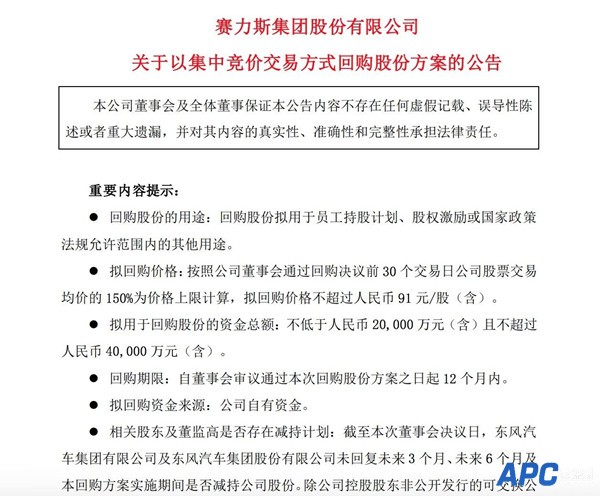 [aipingce]10月25日消息,赛力斯发布公告称,公司拟使用自有资金以集中竞价交易方式回购股份,用于员工持股计划、股权激励或国家政策法规允许范围内的其他用途。拟回购总金额不低于人民币20,000万元且不超过人民币40,000万元;按照公司董事会通过回购决议前30个交易日公司股票交易均价的150%为价格上限计算,拟回购价格不超过91元/股。 本次拟回购数量约为2,197,802 股至4,395,604 股,约占公司目前总股本的比例为0.15%至0.29%,回购期限自董事会审议通过之日起12个月内。 公告称,此次回购是基于对公司未来发展的坚定信心和对公司长期价值的高度认可,为维护公司和股东利益,增强投资者信心,推动公司股票价值的合理回归,促进公司健康可持续发展,树立公司良好的资本市场形象。 ![]() |