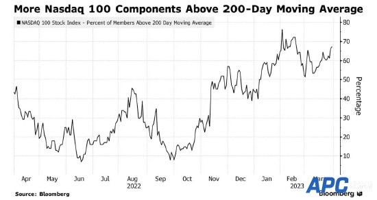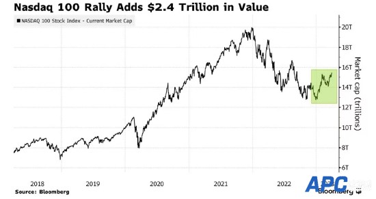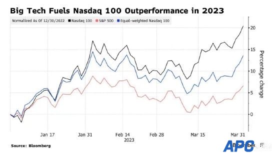 北京时间4月3日早间消息,据报道,2023年第一季度,大型科技股推动美国股市强劲上涨,多家知名科技公司股价出现了近年来最大的季度涨幅。 今年到目前为止,美国大型科技公司受益于多方面利好。银行业动荡让投资者关注到科技股的避险特征。这主要是由于,这些公司有着强劲的资产负债表,同时在经济低迷情况下营收保持稳定。与此同时,对银行业的担忧导致10年期美国国债收益率从4%以上的近期高点跌至3.5%以下,缓解了科技股高估值的问题。 此外,去年的大量抛售导致股价明显下跌,使得大型科技股的相对吸引力有所上升。不过,今年到目前为止的涨幅使得苹果和微软等主要公司的估值高于长期平均水平。 纳斯达克100指数在本季度结束时达到去年8月份以来的最高水平,较去年12月的收盘低点上涨了超过20%,突破了代表新一轮牛市的指标下线。 以下是第一季度代表美股科技股的四个特征: 1、纳斯达克100指数跑赢大盘 ![]() 纳斯达克100指数第一季度上涨20.5%,创下自2020年年中以来的最大季度涨幅。此外,该指数在非加权情况下的涨幅不到14%,这表明涨幅集中在最大的科技公司和互联网公司上。与此同时,金融行业占比更大的标准普尔500指数第一季度的涨幅只有7%。 2、人工智能热潮推动英伟达股价大涨 ![]() 纳斯达克100指数最大的三个成分股也是第一季度涨幅最大的三只股票。特斯拉股价上涨69%。同时,由于投资者看好Meta大幅削减成本的举措,该公司股价上涨76%,创下自2013年以来的最大季度涨幅。 纳斯达克100指数和标准普尔500指数中涨幅最大的是英伟达。该公司今年以来股价上涨了90%,创下自2001年以来的最大季度涨幅。这反映了投资者对人工智能技术的浓厚兴趣,英伟达的芯片被广泛用于聊天机器人和其他人工智能应用。不过,股价大涨也给英伟达股票带来了估值过高的担忧。 3、天量的价值创造 ![]() 今年到目前为止,纳斯达克100指数的涨幅使得该指数市值增加了超过2.4万亿美元,总市值达到约15.5万亿美元,接近2021年底近20万亿美元的峰值。 其中一些股票的表现尤为引人关注。苹果市值在今年初跌破2万亿美元,但目前已反弹至2.6万亿美元。微软的市值在年初跌破1.7万亿美元,但目前也稳定在2万亿美元之上。 Meta距离2021年近1.1万亿美元的市值最高点仍有很远,但第一季度的股价大涨已经使其市值回升至近5500亿美元,远高于去年不到2400亿美元的低点。 4、技术面得到优化 ![]() 今年到目前为止,个股出现了广泛上涨,纳斯达克100指数股票中只有少数出现了两位数比例的跌幅。这使得技术面情况得到优化。目前,该指数约2/3的成分股股价处于200日移动均线上方。相比之下,去年9月下旬,只有不到8%的成分股股价高于200日移动均线。 |