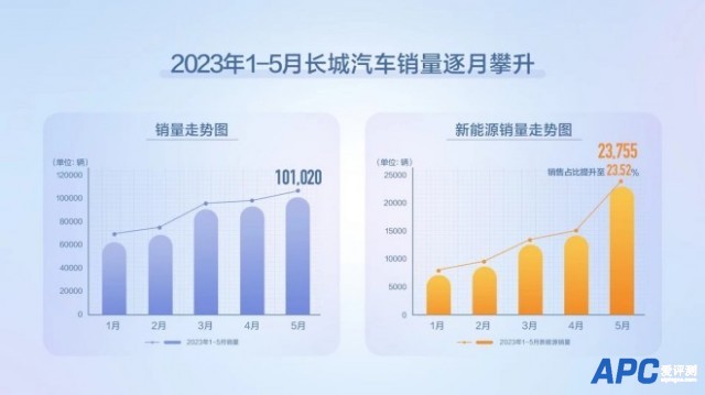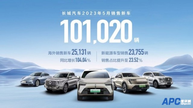 [aipingce]6月5日消息,长城汽车发布2023年5月产销数据,共计销售新车101,020辆,同比增长26.18%,其中新能源车型销量23,755辆,销售占比提升至23.52%。